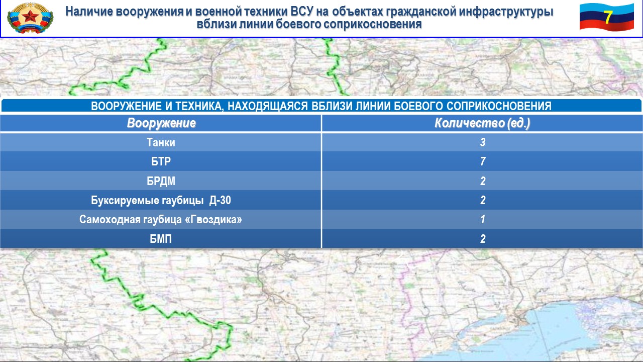 За неделю нашей разведкой отмечались факты размещения трех танков на территории жилого массива в н. п. Дмитровка, двух бронетранспортеров и одной бронированной разведывательно-дозорной машины в жилых кварталах н. п. Передельское, а также размещение трех бронетранспортеров в районе н. п. Войтово. Вся техника принадлежит 46 бригаде ВСУ.
