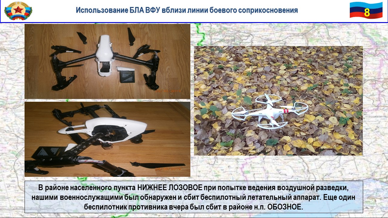 Так, 24 октября в районе населенного пункта Нижнее Лозовое при попытке ведения воздушной разведки нашими военнослужащими был обнаружен и сбит беспилотный летательный аппарат типа «Инспайер», принадлежащий 59 бригаде ВСУ. Фото- и видеоматериалы, снятые с БЛА, переданы в Генеральную прокуратуру Республики и приобщены к уголовному делу в отношении командира 59 бригады Шаповалова. Еще один беспилотник противника вчера был сбит нашими военнослужащими в районе н. п. Обозное.