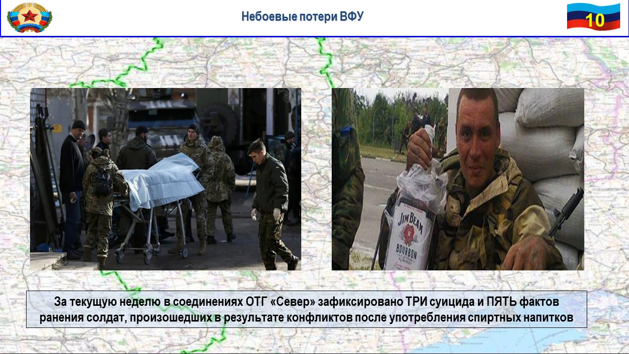 В настоящее время укомплектованность частей и подразделений ВСУ в зоне карательной операции составляет около 60%. Данная ситуация обусловлена постоянным ростом числа небоевых потерь как среди личного состава, так и офицеров. Только за текущую неделю в соединениях ОТГ «Север» зафиксировано три суицида и пять фактов ранения солдат, произошедших в результате конфликтов после употребления спиртных напитков.