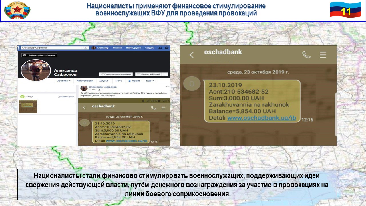 В то же время националисты стали финансово стимулировать военнослужащих, поддерживающих идеи свержения действующей власти, путём денежного вознаграждения за участие в провокациях на линии боевого соприкосновения.