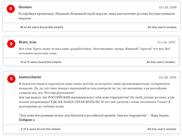 Геймеры возмутились подделкой американской компании Infinity Ward и беспрецедентным уровнем русофобии в ней. «Единицы» на сайтах сопровождаются массой негативных комментариев, в которых Call of Duty: Modern Warfare называют куском г**на, а разработчиков — бессовестными лжецами.