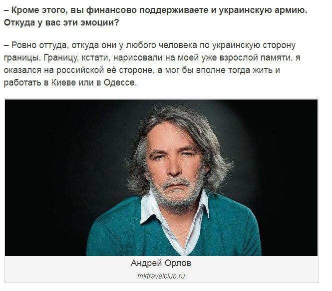 Во мне лично ноль украинской крови, но я тоже политический украинец. И те ребята, которые сейчас сидят в тюрьме за то, что выходили с плакатами за освобождение моряков, Олега Сенцова и крымских татар, они тоже политические украинцы. «Украинец» для меня — это не только генетика, прописка или цвет паспорта, а ещё и счастливое ощущение свободы и желание присоединиться к массе свободных людей, идущих в правильном направлении», — заявил «Орлуша».