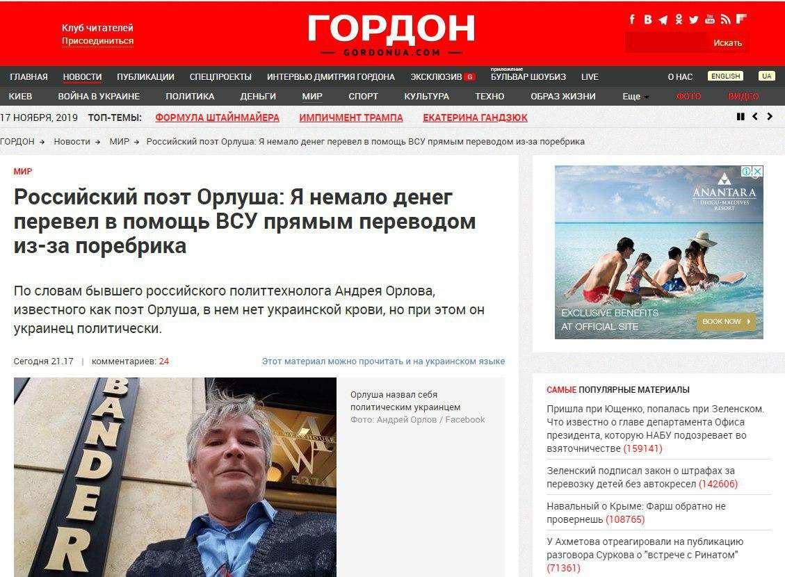 Любимчик российских либералов, салонный «поэт» Орлуша (его настоящее имя — Андрей Орлов), родившийся в Пермском крае, рассказал о своей полной поддержке украинских карателей в конфликте на Донбассе, а также резко выступил против воссоединения Крыма с Россией.