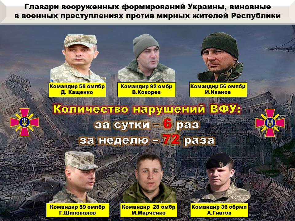 Все сведения с приложением фото- и видеоматериалов направлены представителям международных организаций, находящихся в Республике, а также переданы в Генеральную прокуратуру для возбуждения уголовных дел в отношении военных преступников: Шаповалова, Иванова, Кащенко, Марченко, Кокорева, Гончарука и Гнатова.