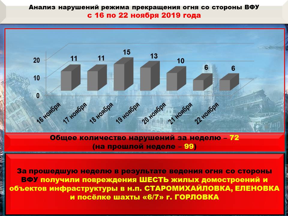 За неделю ВСУ 72 раза нарушили режим прекращения огня, в том числе из запрещённых видов вооружения. По районам 15 населенных пунктов Республики противник выпустил 17 артиллерийских снарядов калибром 152 мм, 67 мин калибром 120 и 82 мм и 228 гранат различного типа.