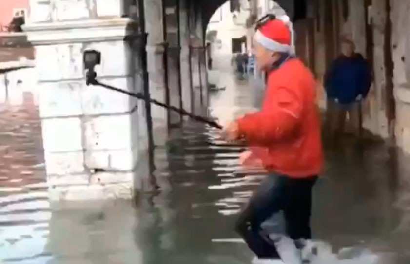 Видео происшествия опубликовал другой турист в своём микроблоге. На кадрах видно, как мужчина в шапке Санта-Клауса, шагая по затопленной улице с селфи-палкой, ушёл с головой под воду в одном из местных каналов.