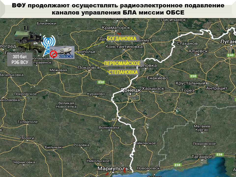 Кроме того, командование ВСУ с целью сокрытия военной техники и тяжелого вооружения продолжает активно использовать подразделения РЭБ для глушения сигналов управления БПЛА миссии ОБСЕ.