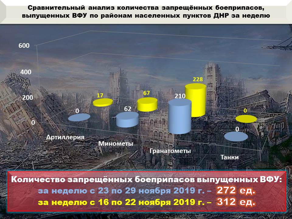 За неделю ВСУ 63 раза нарушили режим прекращения огня, в том числе из запрещённых видов вооружения. По районам 17 населенных пунктов Республики противник выпустил 62 мины калибром 120 и 82 мм и 210 гранат различного типа.