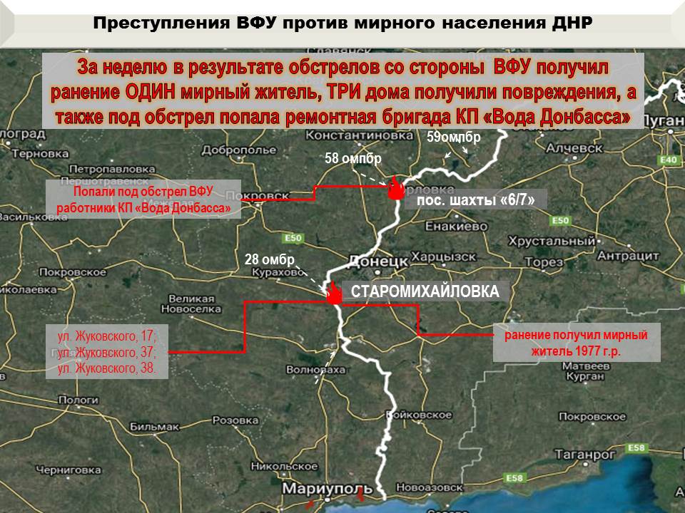 В результате обстрелов ВСУ н. п. Старомихайловка один мирный житель, 1977 г. р., получил ранение, три домостроения разрушены, а также под обстрел попала ремонтная бригада КП «Вода Донбасса» в посёлке шахты 6/7 г. Горловки.