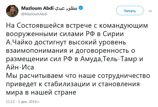 «На Состоявшейся встрече с командующим вооруженными силами РФ в Сирии А.Чайко достигнут высокий уровень взаимопонимания и договоренность о размещении сил РФ в Амуда,Тель-Тамр и Айн-Иса Мы расчитываем что наше сотрудничество приведет к стабилизации и становления мира в нашей стране», — написал курдский военачальник (оригинальная орфография сохранена — прим. РВ).