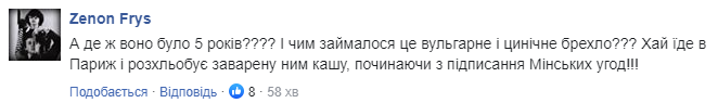 «А где же оно было 5 лет???? И чем занималось это пошлое и циничное брехло??? Пусть едет в Париж и расхлебывает заваренную им кашу, начиная с подписания Минских соглашений!!!»