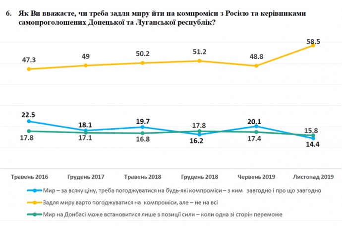 Согласно опросу, лишь 14% украинцев считают, что ради мира стоит соглашаться на любые компромиссы. По сравнению с июнем 2019 года количество сторонников этой точки зрения уменьшилось на 6%.