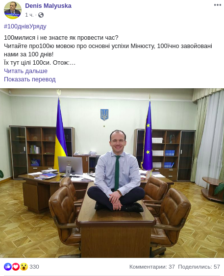 На фотографии в пустом кабинете он сидит по-турецки на столе и улыбается в камеру, подтверждая для читателей, что он доволен 100 днями в правительстве и результатом работы в Министерстве. В комментариях обратили на это внимание.