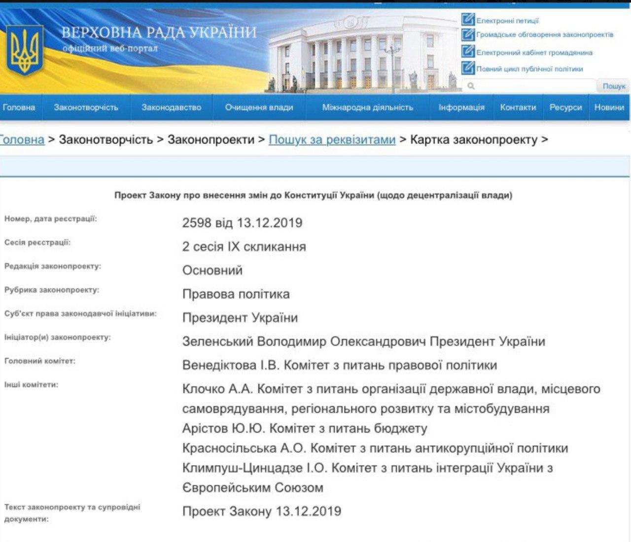 В Верховной раде зарегистрирован срочный законопроект президента Владимира Зеленского об изменениях в Конституцию Украины относительно децентрализации власти.