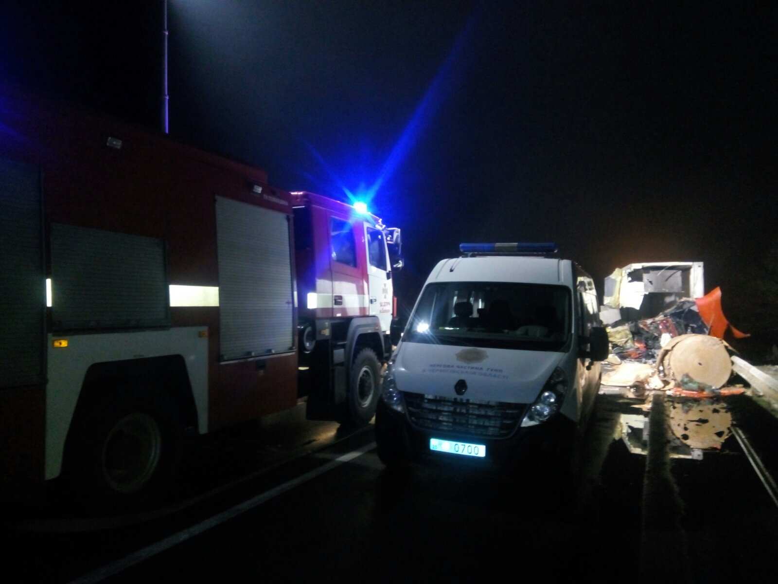 В полиции рассказали, что в момент столкновения с пассажирским автобусом из грузовика, которым управлял гражданин Сербии, вылетел груз (рулоны бумаги). Рулоны выпали на дорогу и повредили ещё один автомобиль.