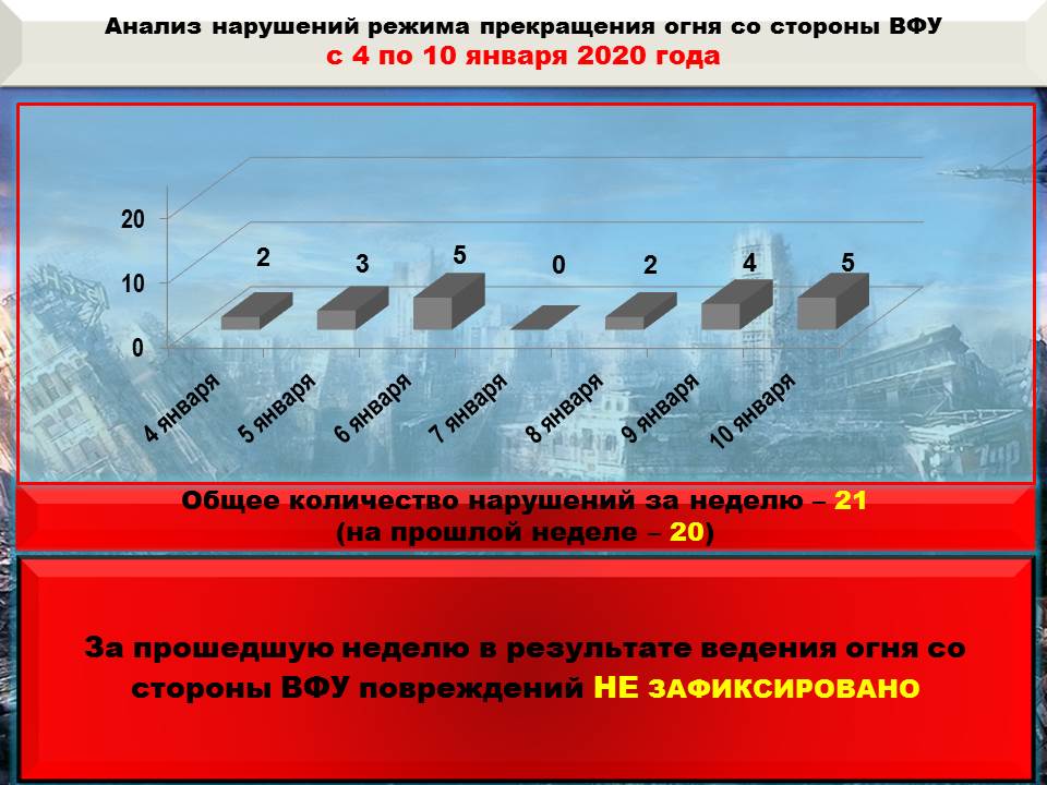За неделю ВСУ 21 раз нарушили режим прекращения огня, в том числе из запрещённых видов вооружения. По районам 14 населенных пунктов Республики противник выпустил 86 боеприпасов различного типа.
