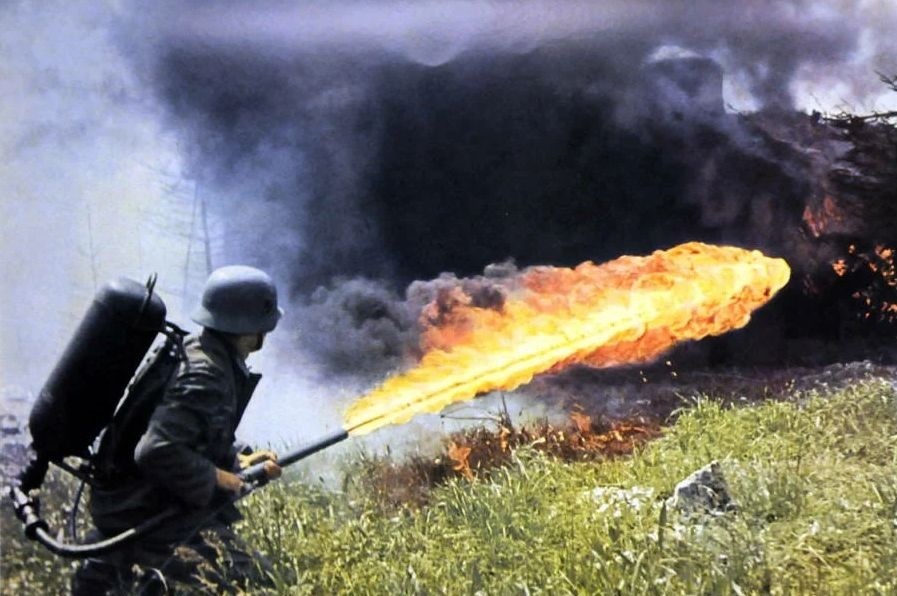 На одном из них он показывает своего подельника-неонациста с наполовину закрытым лицом в каске и форме солдат Третьего рейха, в руках у него огнемёт.