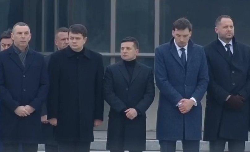 Помимо Зеленского, в церемонии принимают участие спикер Верховной рады Дмитрий Разумков, премьер-министр Алексей Гончарук (сохранивший свой пост, несмотря на недавний скандал), глава «Международных авиалиний Украины» Евгений Дыхне и другие.