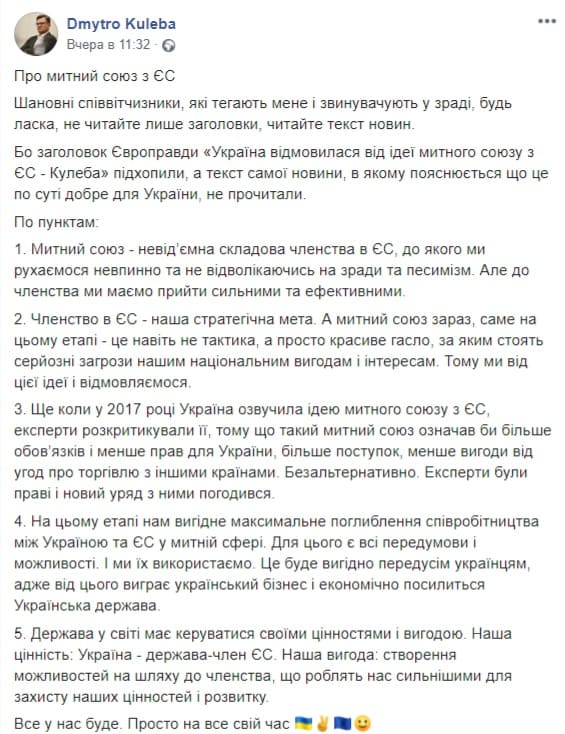 В третьем пункте вице-премьер Украины поясняет, что новая власть вняла критике экспертов, которые выступили против идеи таможенного союза ещё в 2017 году из-за того, что она несёт в себе больше обязанностей и меньше прав для страны, больше уступок и меньше выгоды от торговых соглашений с другими странами.