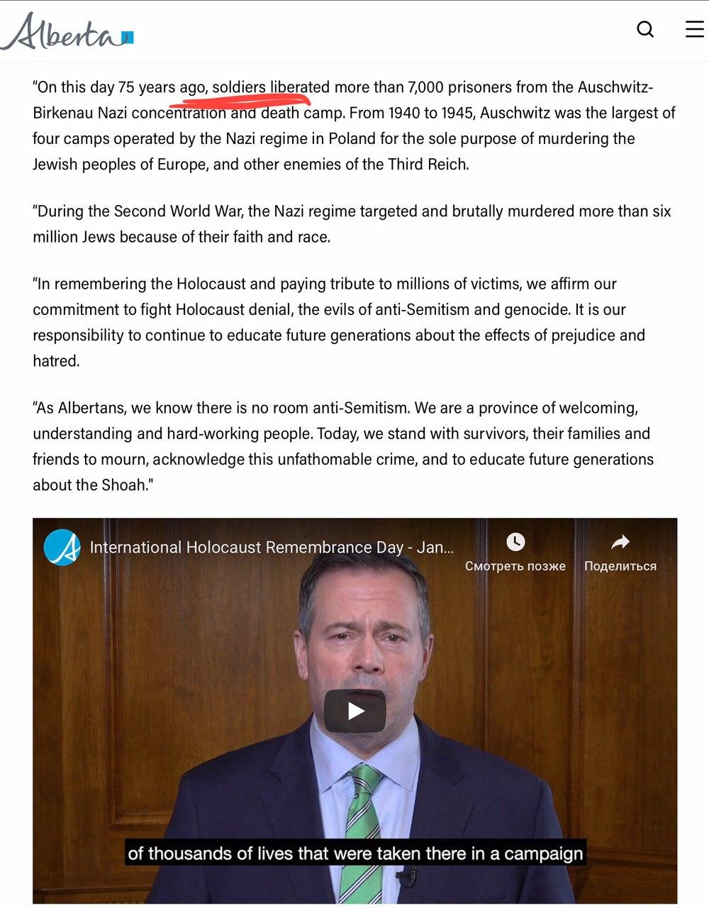 Амнезией исторической памяти пострадал и Джейсон Кенни, Премьер-министр одной из канадских провинций. В своём официальном обращении объявил о том, что Аушвиц 75 лет назад освободили «украинские солдаты». Когда подписчики ему прямо указали на то, что это не так, Джейсон тут же исправил своё обращение. Только теперь концлагерь освободили… просто «солдаты», неизвестно какие.