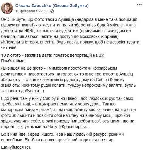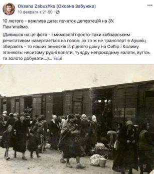 Недавно украинская писательница Оксана Забужко опозорилась с публикацией исторической фотографии прибытия поезда с евреями из Венгрии в Освенцим, которую она выдала за кадр депортации украинцев «на Сибирь и Колыму».