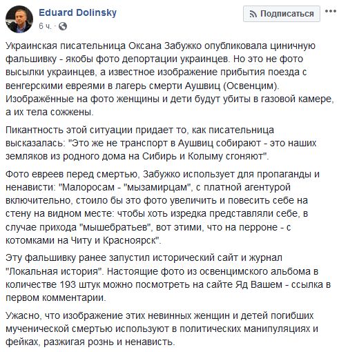 Долинский отметил, что фейк с фотографией запустила первой не Забужко, она лишь воспользовалась непроверенной информацией с украинского исторического сайта и журнала «Локальная история».