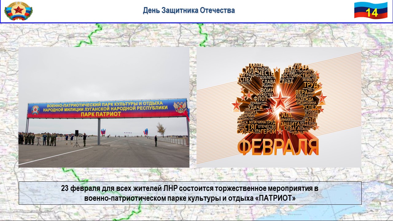 23 февраля в честь празднования Дня защитника Отечества для всех жителей Луганской Народной Республики состоится торжественное мероприятие в военно-патриотическом парке культуры и отдыха «Патриот» на территории бывшего аэропорта Луганска.