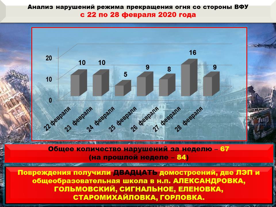 За неделю ВСУ 67 раз нарушили режим прекращения огня, в том числе из запрещённых видов вооружения.