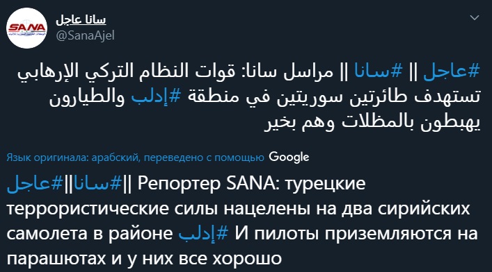 Турция в ответ заявила, что сбила два сирийских самолета Су-24. В Дамаске это подтвердили и заверили, что пилоты успешно катапультировались и сели на своей территории.