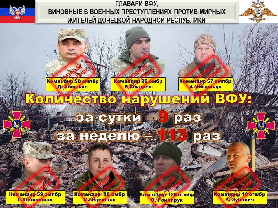 На донецком направлении каратели из 92-й и 28-й бригад по приказам преступников Кокорева и Марченко обстреляли из гранатомётов различных систем, крупнокалиберных пулемётов и стрелкового оружия районы населённых пунктов Старомихайловка и Спартак.