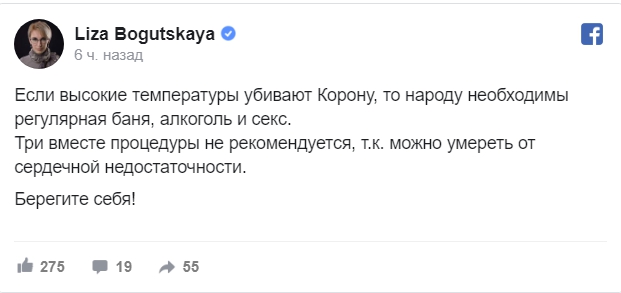 Народный депутат от фракции «Слуга народа» Елизавета Богуцкая считает, что в борьбе с коронавирусом эффективными будут алкоголь, баня и секс. Об этом она написала у себя на странице в соцсети.