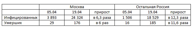 Если в период с 5 по 12 апреля число заражённых увеличилось в 2,9 раза, то с 12 по 19 апреля — в 2,7 раза. Некоторое замедление темпов наблюдается и по числу жертв эпидемии.