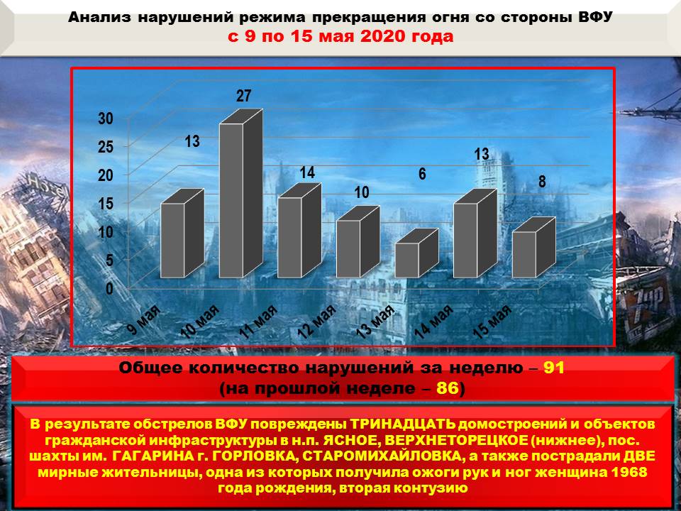 В результате обстрелов ВСУ повреждены 13 домостроений и объектов гражданской инфраструктуры в н. п. Ясное, Верхнеторецкое (нижнее), пос. шахты им. Гагарина в г. Горловке, Старомихайловка, а также пострадали две мирные жительницы, одна из которых, 1968 г. р., получила ожоги рук и ног, вторая — контузию.