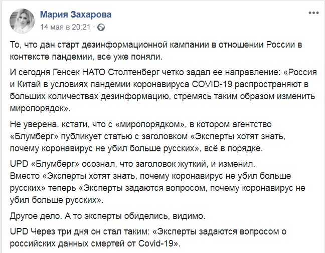 «И сегодня генсек НАТО Столтенберг четко задал ее направление: „Россия и Китай в условиях пандемии коронавируса Covid-19 распространяют в больших количествах дезинформацию, стремясь таким образом изменить миропорядок“. Не уверена, кстати, что с „миропорядком“, в котором агентство „Блумберг“ публикует статью с заголовком „Эксперты хотят знать, почему коронавирус не убил больше русских“, всё в порядке», — отметила сотрудница МИД.
