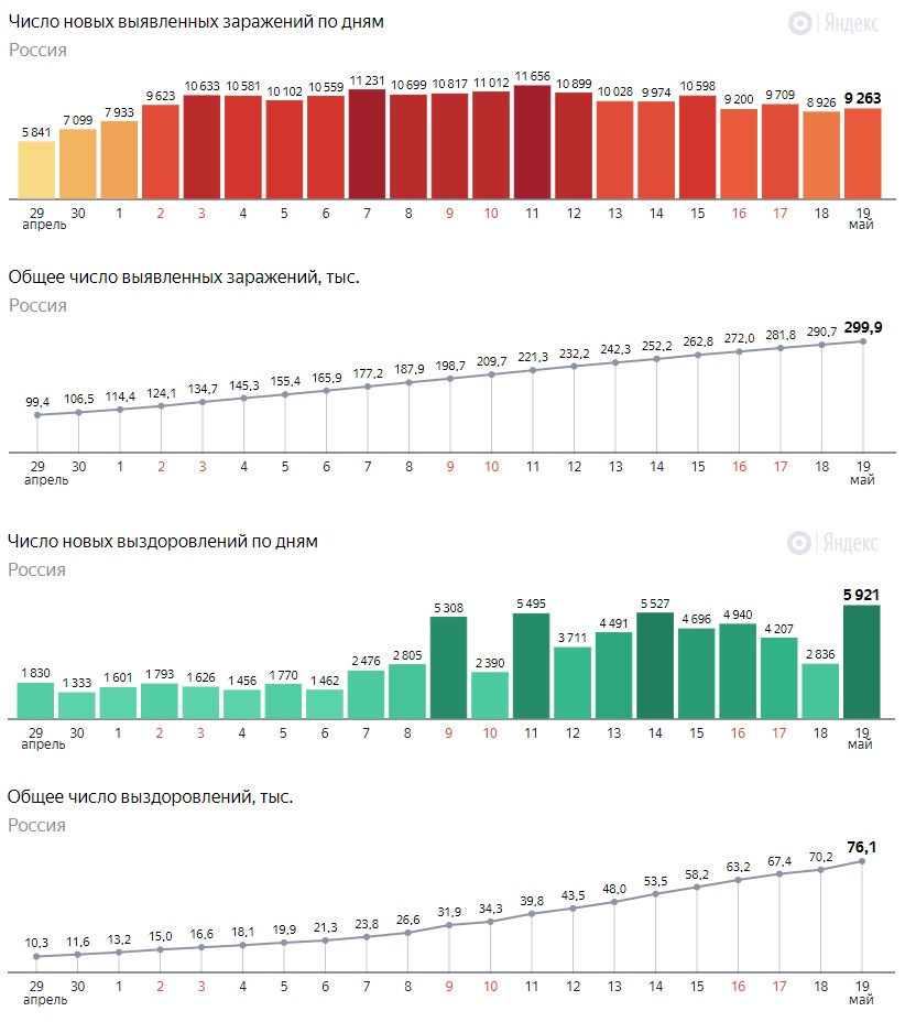 За последние сутки в России выявлено 9 263 новых случая заражения коронавирусом в 83 регионах. Общее число заболевших в России практически достигло 300 тысяч человек (299 941).
