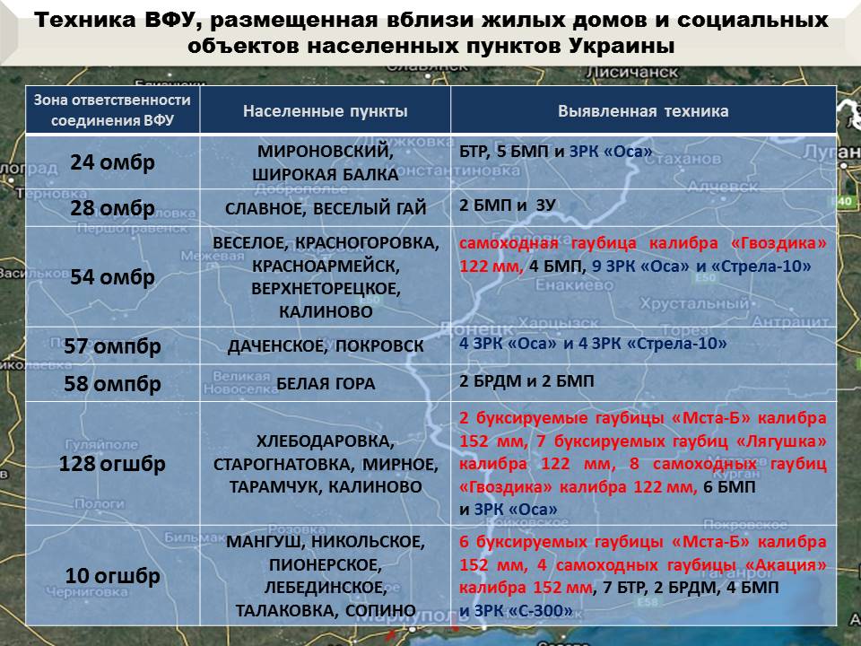 За истекшую неделю нашей разведкой выявлено размещение 25 артиллерийских систем калибра 152 и 122 мм из состава 10, 54, 128 бригад ВСУ в районе н. п. Веселое, Зачатовка, Калиново, Мангуш и Никольское, а также 35 боевых бронированных машин из состава 10, 24, 28, 54, 57, 58 и 128 бригад в н. п. Мироновский, Широкая Балка, Белая Гора, Даченское, Покровск, Мирное, Славное, Веселое, Красногоровка, Верхнеторецкое, Старогнатовка, Тарамчук, Никольское, Пионерское, Лебединское, Талаковка и Сопино.
