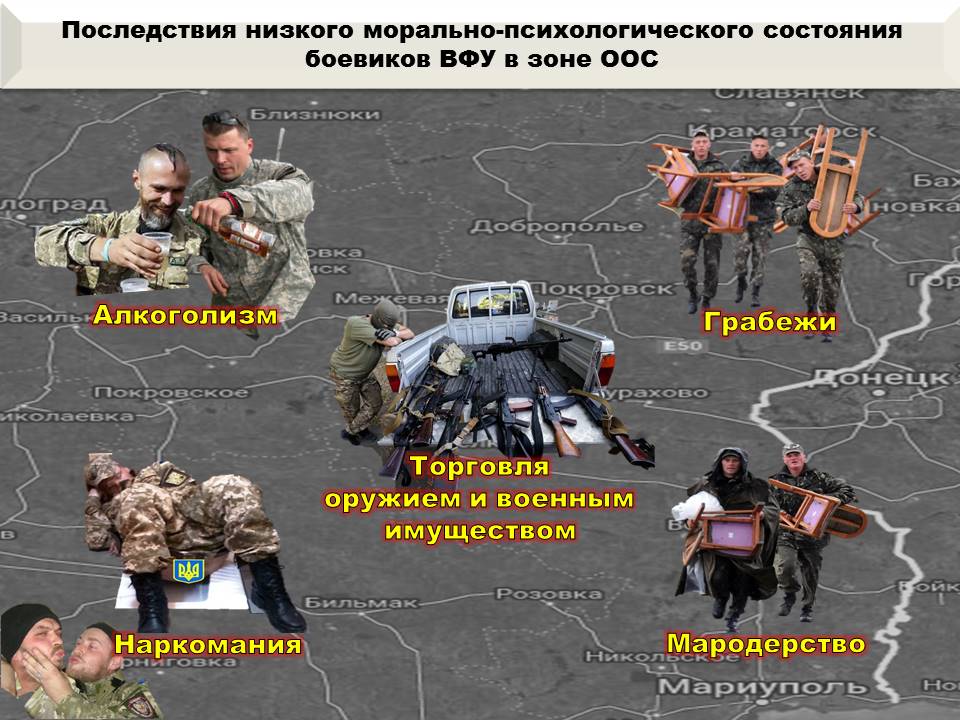Низкий уровень укомплектованности и обеспеченности соединений ВСУ, а также коррупция и поборы со стороны командного состава привели к снижению уровня морально-психологического состояния украинских военнослужащих до критических показателей, при которых становится практически невозможно погасить волну преступности, алкоголизма и наркомании, поразившую все украинские подразделения в зоне «ООС».