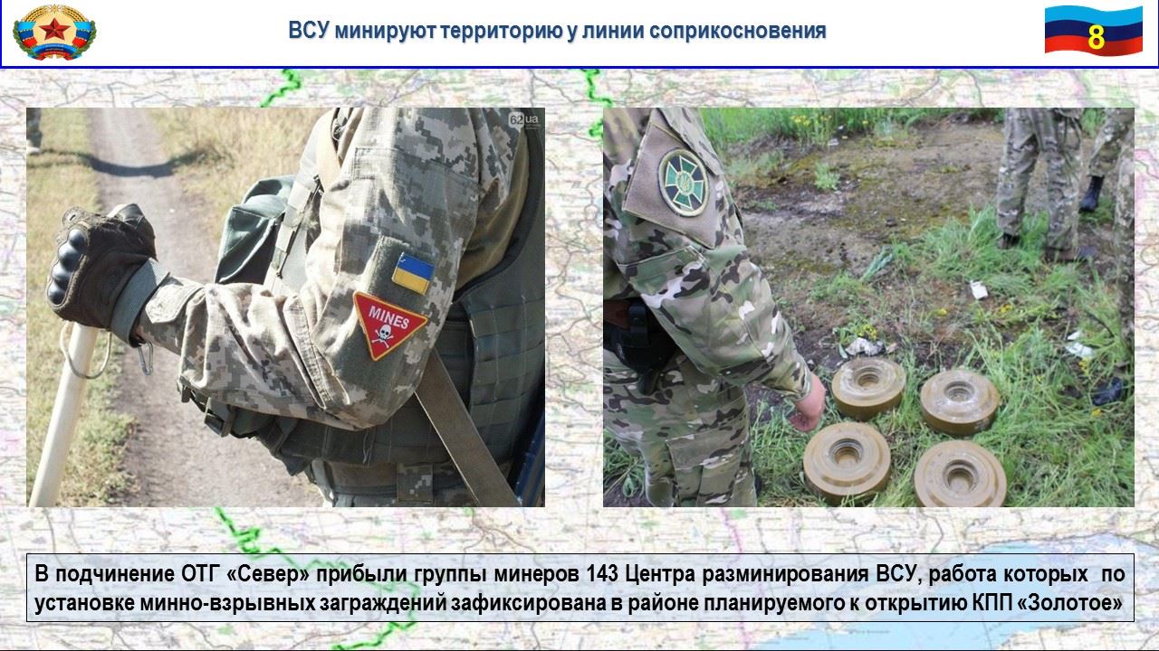 Несмотря на заявления украинской стороны о заинтересованности в открытии новых КПП на Донбассе, ВСУ, в нарушение требований Женевской конвенции продолжают минирование территорий у линии соприкосновения, активизировав свои противоправные действия с введением в подразделениях НМ полной боевой готовности.