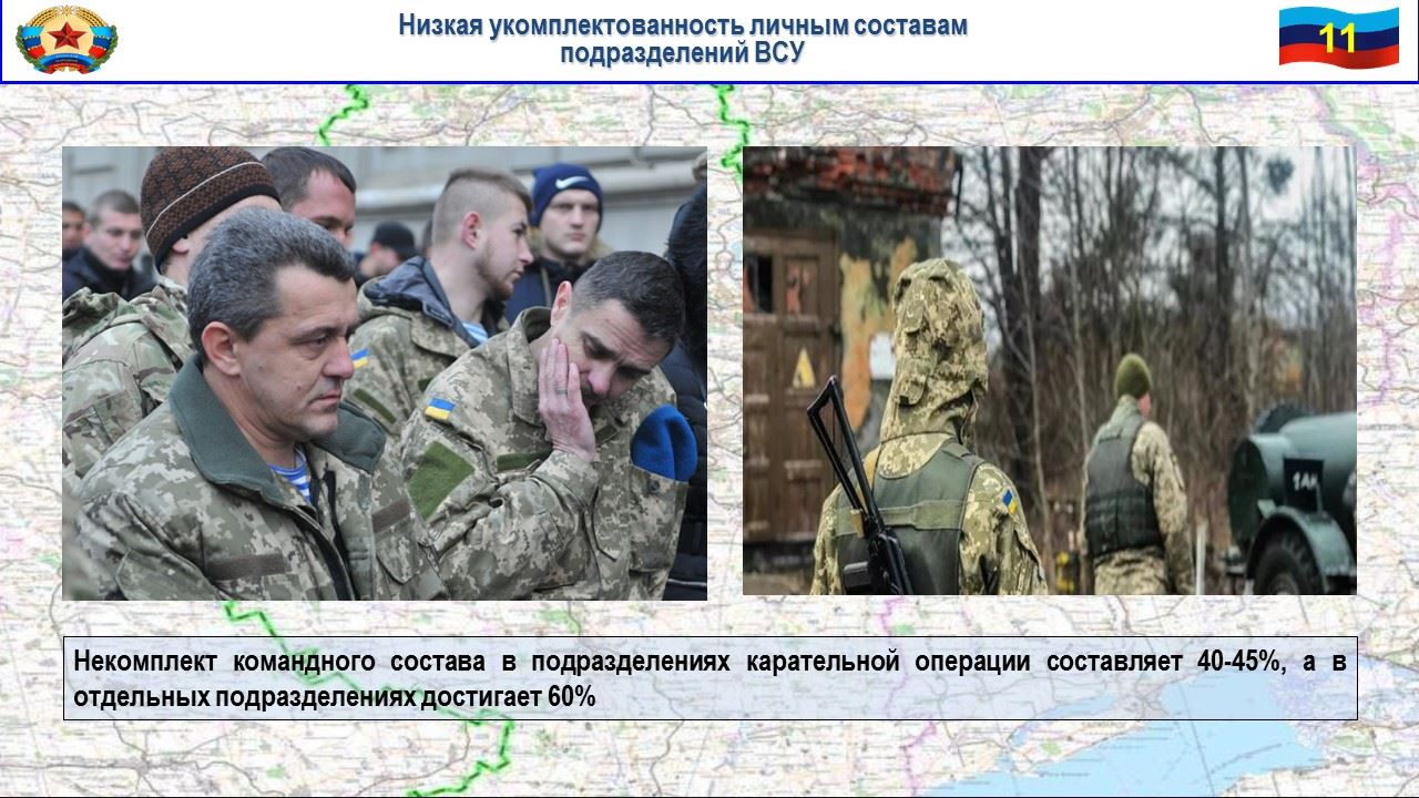 Командование ВСУ обеспокоенно низкой укомплектованностью личным составом подразделений ВСУ, процент которой продолжает резко снижаться из-за низкой привлекательности военной службы. Особую озабоченность вызывает массовое увольнение младшего офицерского состава, проходящего службу в зоне так называемой «ООС».