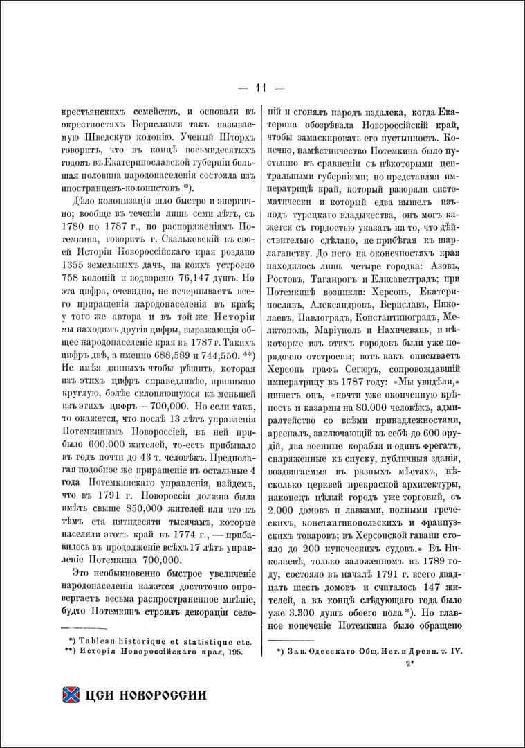 Предполагая подобное же приращение в остальные 4 года Потемкинского управления, найдем, что в 1791 году Новороссия должна была иметь свыше 850 000 жителей, или что там к ста пятидесяти тысячам, которые населяли этот край в 1774 году — прибавилось в продолжении всех 17 лет управления Потемкина 700 000 (стр.11)».