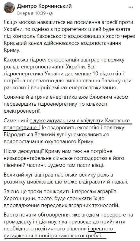 Ликвидация водохранилища позволит оздоровить экологию и политику, пишет в своих соцсетях Корчинский.