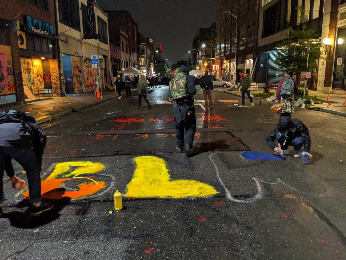 В зоне можно увидеть такие лозунги: «Нет копам» и «Копы всегда будут расистами, потому что капитализму нужно неравенство».