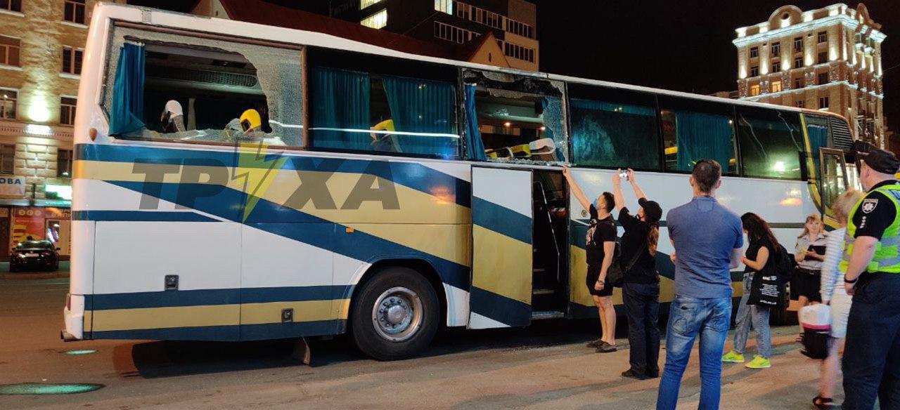 Как сообщают очевидцы, неизвестные молодчики закидали автобусы камнями вечером 17 июня в районе Холодной горы. Были разбиты несколько окон, однако никто из активистов, находившихся в автобусах, не пострадал.