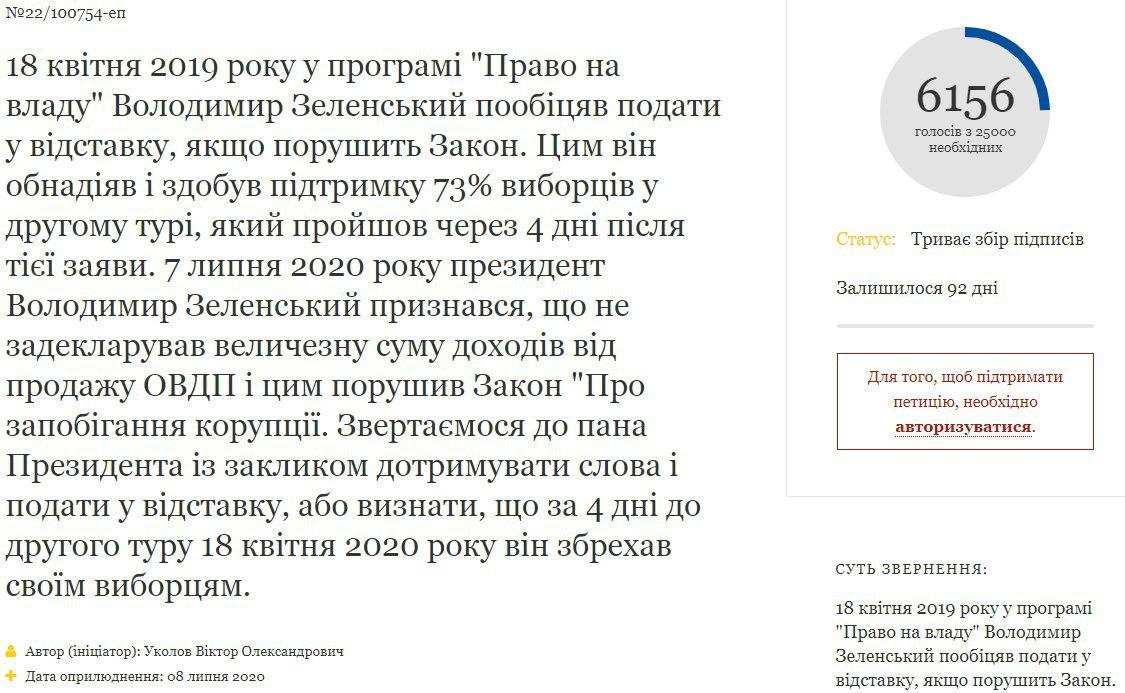 По состоянию на утро 9 июня петиция набрала 6156 голосов. Если число подписантов дойдёт до 25 тысяч за три месяца, Зеленскому придётся рассмотреть требование о собственной отставке.
