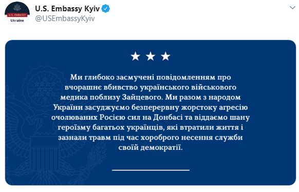 «Мы глубоко опечалены сообщением о вчерашнем убийстве украинского военного медика вблизи Зайцево, — лицемерно говорится в сообщении посольства США. — Мы вместе с народом Украины осуждаем беспрерывную жестокую агрессию возглавляемых Россией сил на Донбассе и отдаем дань уважения героизму многих украинцев, которые потеряли жизни и подверглись травмам во время храброго несения службы своей демократии».