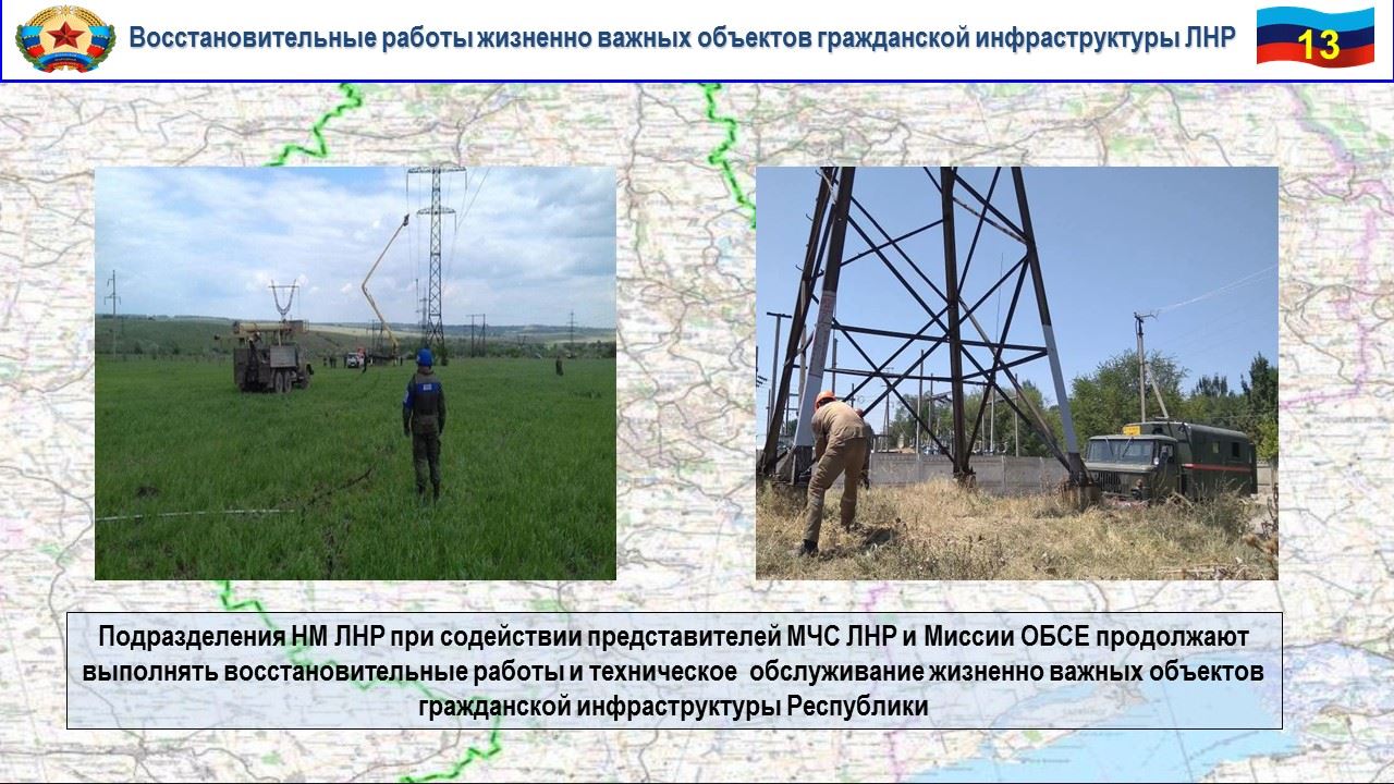 В течение недели подразделениями Народной милиции ЛНР при содействии представителей МЧС ЛНР и Миссии ОБСЕ продолжаются восстановительные работы жизненно важных объектов гражданской инфраструктуры.