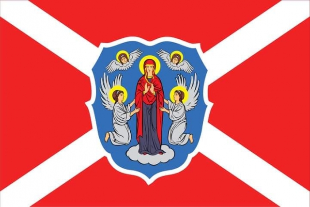 Графическое изображение флага с белым Андреевским крестом и Богородицей было создано в Минске. Сделано в Белоруссии.