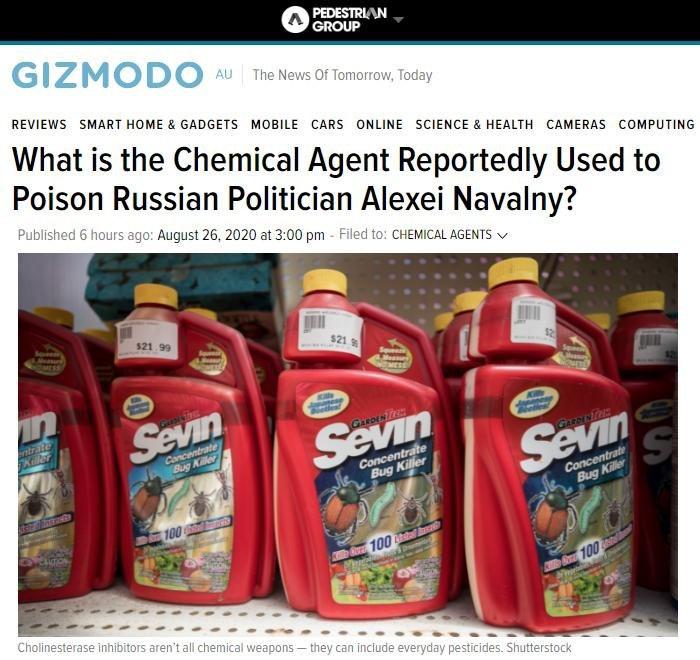 «Мем смешной, ситуация страшная — всё на совести австралийского портала Gizmodo, решившего наградить Алексея Навального лаврами любителя выпить „Крота“ Бари Алибасова. Представленный материал источник украсил фотографией магазинной полки со средствами от насекомых и заявил, что причиной комы блогера могло послужить употребление инсектицидов внутрь. Ждём возмущённой реакции сторонников пострадавшего», — пишут аналитики Telegram-канала «Расстрельный».
