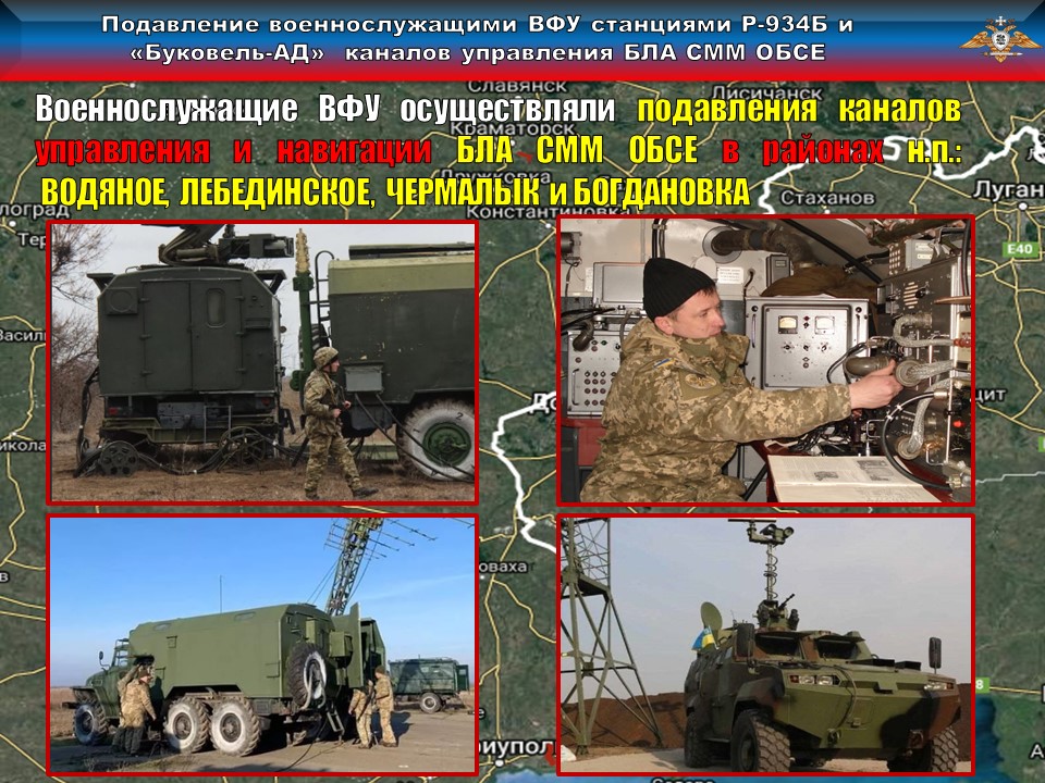 С целью недопущения обнаружения беспилотниками СММ ОБСЕ техники в зоне ответственности 36-й бригады, зафиксировано применение двух мобильных групп от 305 отдельного батальона РЭБ с задачей подавления станциями Р-934Б и «Буковель-АД» каналов управления и навигации БЛА СММ ОБСЕ в районах н. п. Водяное, Лебединское и Чермалык, а в зоне ответственности 53-й бригады противник применял средства РЭБ и в районе н. п. Богдановка.