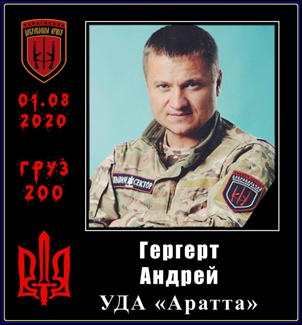 01.08.2020 — Гергерт Андрей Валерьевич, 1978 г. р., заместитель командира УДА*, ранее — командир 8 ОБ УДА «Аратта», личность для «щеневмерликів» не просто известная, а легендарная! В 2013 году принимал активное участие в Киевском «Евромайдане», где практически сразу же присоединился к вооруженному формированию «Правый сектор»*. С 2014 года добровольно отправился в зону «АТО/ООС», где за деньги истреблял мирное население Донбасса.